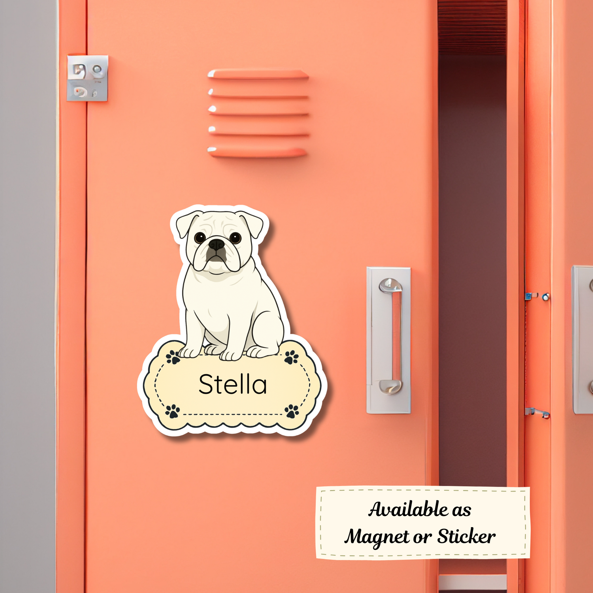 Aimant bouledogue anglais personnalisé – Blanc | Personnalisable avec le nom de l'animal