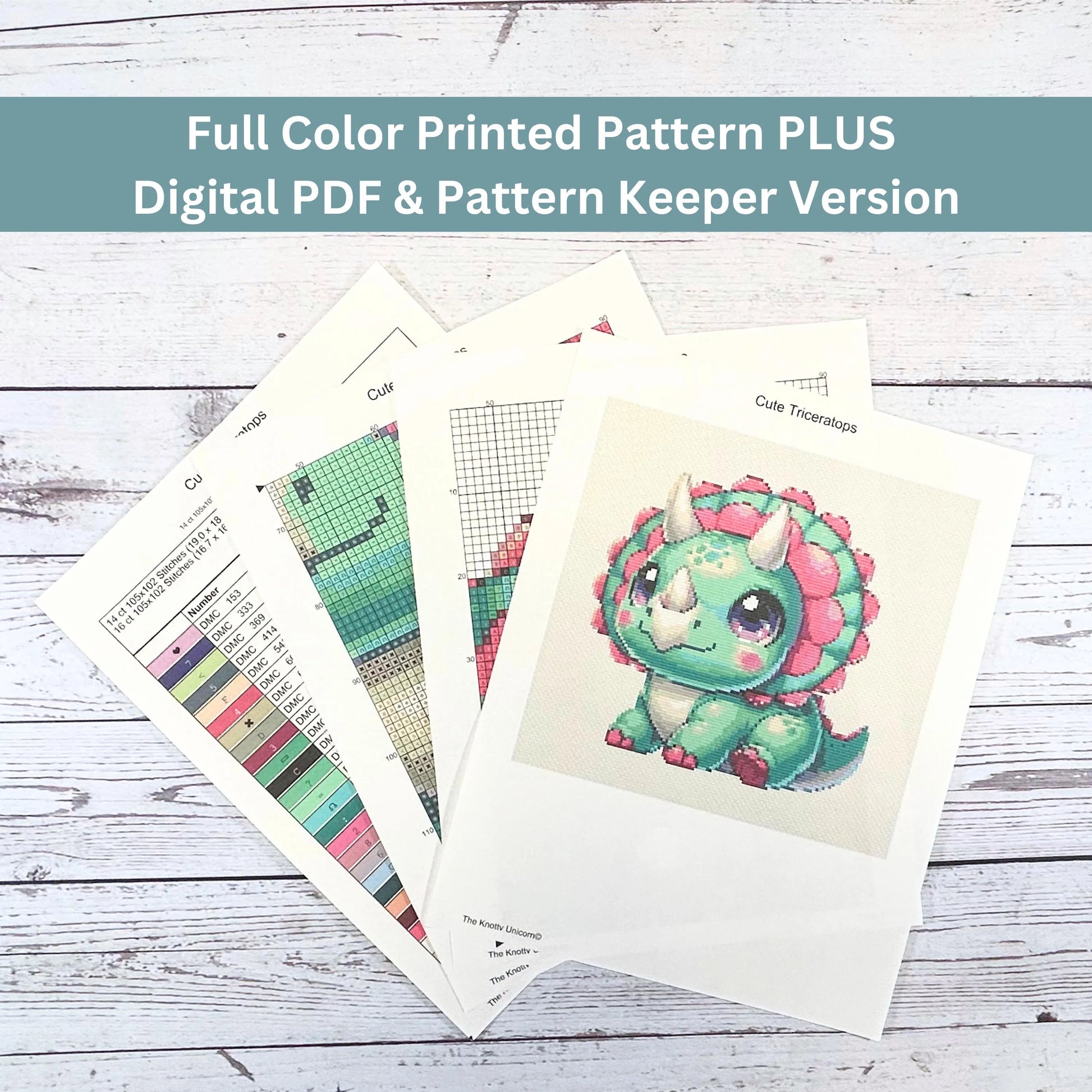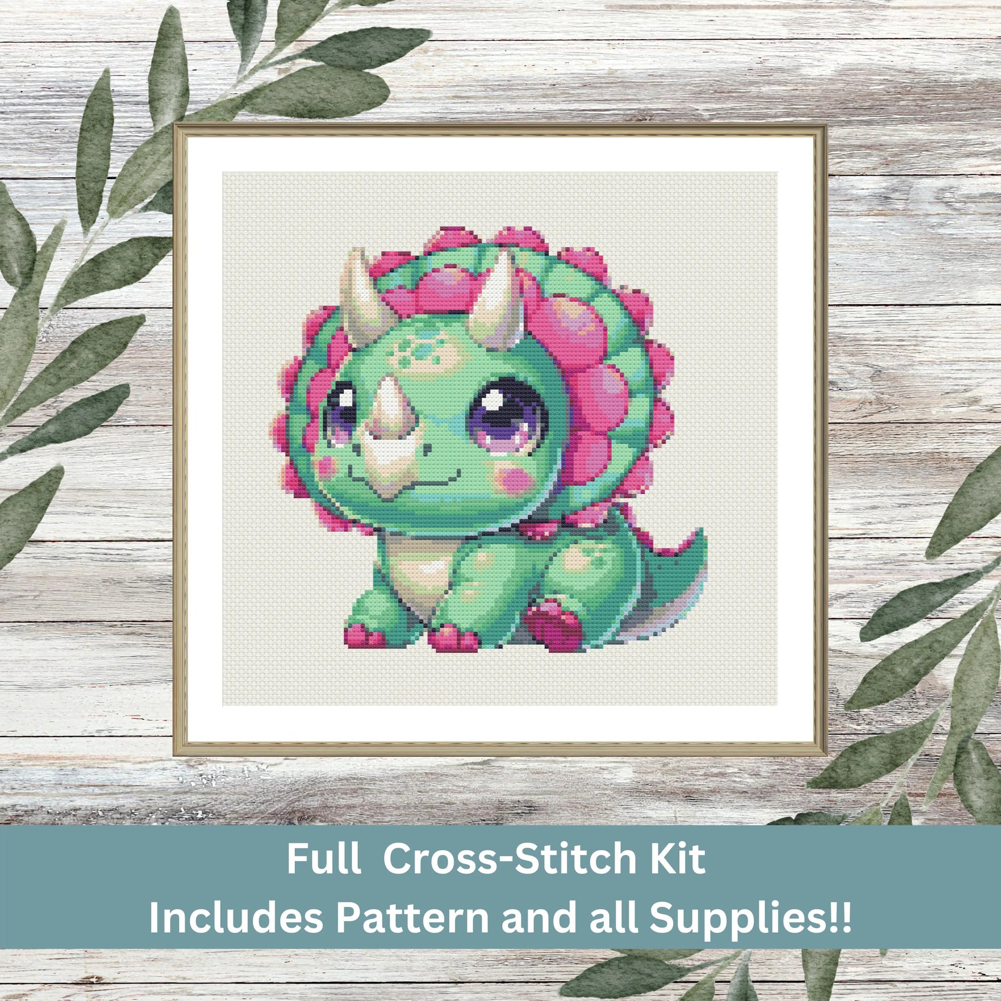 Stitch this cute baby triceratops with this full cross-stitch kit! This design features a sweet green dinosaur with pink frills and big, expressive eyes—perfect for dino lovers, kids’ room decor, or a fun weekend project. Whether you're a beginner or an experienced stitcher, this kit provides everything you need to create a beautiful handmade embroidery piece.